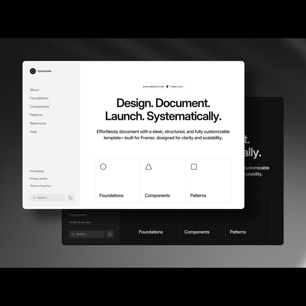View Demo -> Crafted for precision and ease, Systematic is a beautifully designed documentation template that brings structure and clarity to your content. Built with a seamless CMS, intuitive navigation, and a polished UI, it’s the perfect solution for product teams, design systems, knowledge bases, and technical documentation. With its clean, functional design and a focus on readability, Systematic ensures your documentation is both professional and accessible—allowing users to find what they need, effortlessly. What’s Included 15 page types5 CMS collectionsLight & Dark modeHigh-speed performanceOptimized for accessibilityAbout pageContact formNewsletter signupTutorials Refund policy All sales are final due to the digital nature of our products, and refunds are not available. Please review all product details carefully before purchasing. If you have any questions or need clarification, feel free to reach out before completing your order. Exclusive offer Get 3 months of Framer Pro (annual plan) for free with your template purchase. An exclusive discount code will be included with your order. Need help? For any questions, reach out at [email protected].